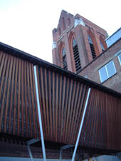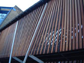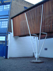 bridge in Kennington Our client had purchased two office buildings which needed to be connected together, without removing the parking spaces between the buildings. The solution was a timber and steel bridge slung at an angle from one building to the other. A refurbishment of the offices was also carried out. This project was completed a decade ago and we have recently revisited it: the bridge is as good as new, and some of the photographs opposite are recent. Project cost: £50,000