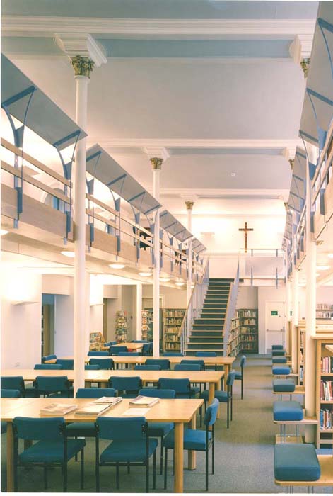 library for a girls school This project involved the refurbishment of an existing historic listed building - the old chapel - to provide a new library for a girls school. We inserted a galleries mezzanine level with the existing tall space, and connected through to adjacent seminar spaces. Project cost: £400,000