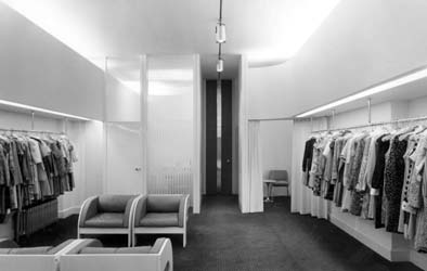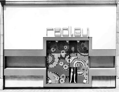 Radley Shop, Eastcastle Street This project dates from the 1960s - it is a shop for the fashion house Alfred Radley, who worked with Ossie Clark and Celia Birtwell. The fabric in the shop window is by her. Austin Winkley also designed the famous 1960's Quorum boutique on the Kings Road for Ossie Clark and Radley, but we do not have any images of that shop. click to return to selected projects