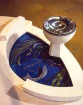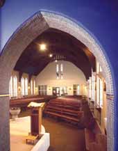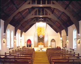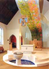 St Francis Church, Long Eaton The interior of St Francis was altered to provide a new sanctuary and chapel. Intensive work with a series of artists resulted in a powerful statement in what had been a run-of-the-mill 1950’s building. The large canopy projecting over the altar has the effect of pushing the sanctuary out towards the congregation. Painted by Marianne John, it depicts the Tree of Life, with a dove hovering above the font and shallow pool in an evocation of the Piero della Francesca Baptism of Christ. A boldly decorated side chapel provides place for the tabernacle, and the purpose-made furniture completes the project. Project cost: £50,000 click to return to selected projects